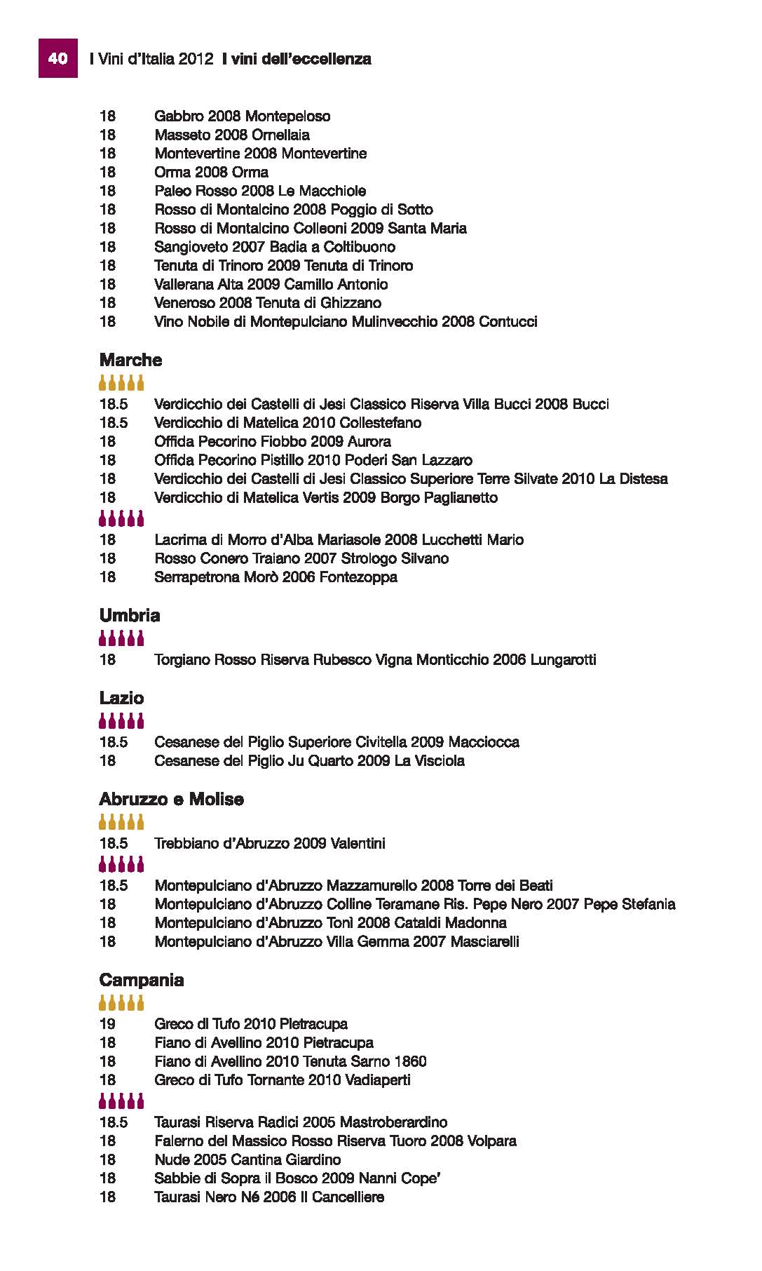 Strano non vedere fra le eccellenze marchigiane il miglior verdicchio degli ultimi (molti) anni: il Riserva Gioacchino Garofoli 2006. Questa è una cosa che accumuna Gambero Rosso e L’Espresso; il primo ha dato il titolo di bianco dell’anno ad un Verdicchio (ci mancherebbe altro! ) ma non è questo di Garofoli; L’Espresso non gli dà l’eccellenza……forse son io ad aver le visioni degustative!!! . Ciao