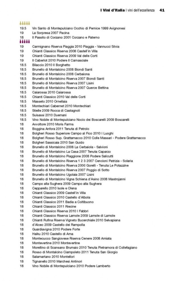 Giunta alla sua tredicesima edizione, la Guida I Vini d’Italia de L’Espresso è l’ormai consueta fotografia, puntuale e ricca di dettagli, dell’attualità vinicola del nostro paese. Un volume di agile formato e facile consultazione che sottopone la produzione enologica nazionale ad una selezione attenta e sistematica effettuata su ben 25.000 vini assaggiati. Non mancano le informazioni di carattere generale, con indicazioni sulla conservazione, sul servizio del vino, sugli abbinamenti, unite alla presenza di un utile glossario tecnico. Una serie di ragguagli forse superflui per i conoscitori più evoluti, ma indispensabili per tutti coloro che si avvicinano con curiosità al vino e desiderano saperne di più.