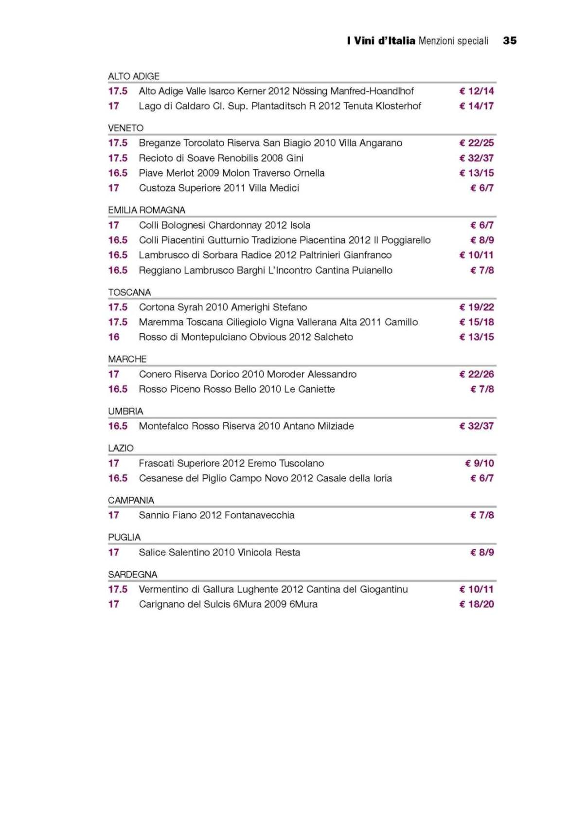 Tra i vini rossi si confermano, oltre alle tipologie sopra citate, tutte le principali denominazioni, dagli Amarone della Valpolicella ai Montepulciano d’Abruzzo, dai Sangiovese di Romagna ai possenti rossi pugliesi. Non mancano però le sorprese, costituite dall’approdo ai livelli dell’eccellenza di vini meno noti ma di straordinaria bevibilità quali il Bardolino di Giovanna Tantini, il Groppello di Piero Pancheri e il Santa Maddalena di Georg Ramoser. Ricordiamo infine che più di un quarto dei vini di eccellenza arrivano in enoteca a un prezzo inferiore ai 15 euro: si può bere benissimo senza svuotarsi il portafoglio.