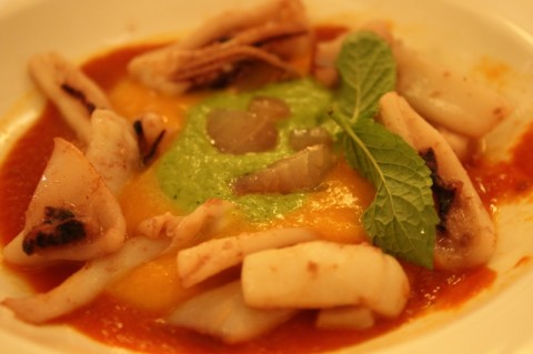 In sala tante presenze che hanno potuto degustare un delizioso alternarsi di piatti di carne e pesce. L’ingresso è stato affidato alla ricottina al profumo di limone: interessante il prodotto proveniente dalla penisola Sorrentina. Bello già alla vista l’antipasto, calamari su crema di zucca a contornare pezzi di triglia affumicata, quasi fluttuante su un tappeto verde di zucchine.