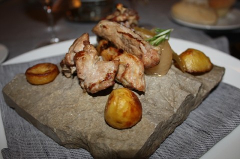 Finale da urlo: agnellino laticauda servito su pietra (particolarmente abbondante in questo suggestivo angolo verde della terra telesina) accompagnato da patate e cipolle. Entusiasmante il sapore, la dolcezza e la tenerezza della carne, che la cottura ha lasciato praticamente intatta. Agnello ovviamente sannita, proveniente dalla zona Paduli-Buonalbergo, alle porte della terra fortorina.