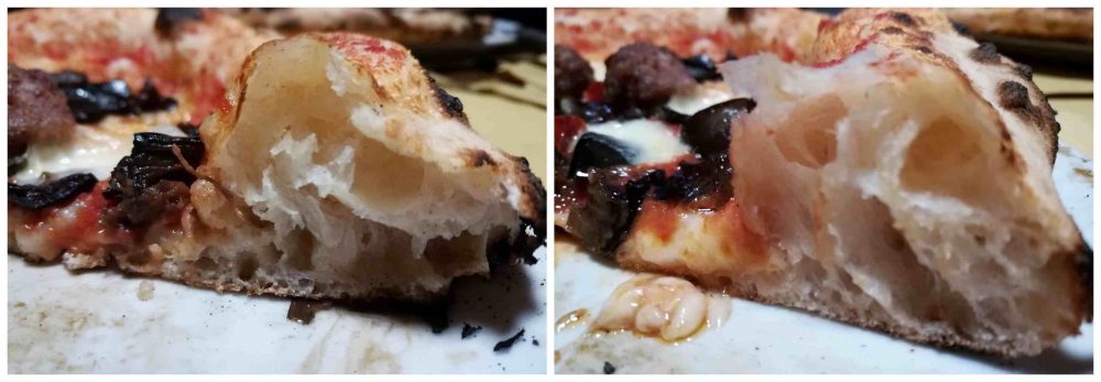 Il reparto Pizzeria lavora sia per la sala che per l’asporto e pertanto l’impasto preparato viene pensato per soddisfare anche le esigenze di lavorabilità dei cosiddetti “metri di pizza”. Quindi per la farina Tipo 0 qui utilizzata ci si ferma ad una idratazione di circa il 62%. La stesura del disco è alla Napoletana con i cornicioni (leggermente più alti rispetto alle dimensioni di disciplinare) che al taglio mostrano un’ampia alveolatura a denotare una corretta lievitazione che dona leggerezza alla pizza.