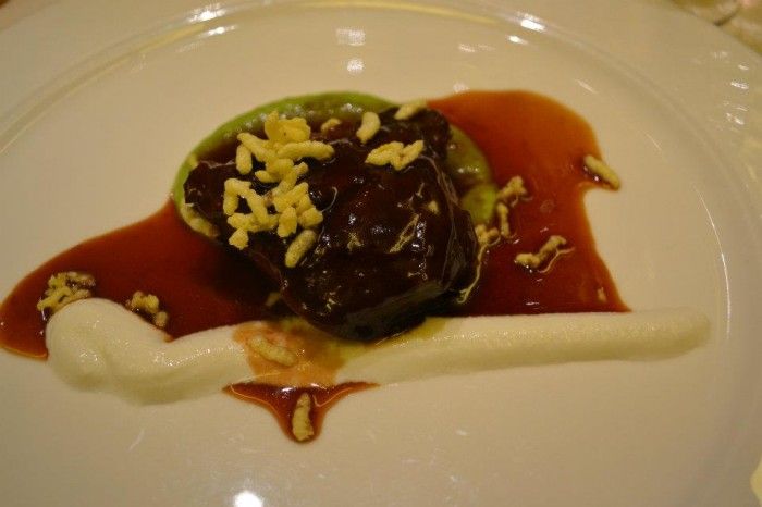 Al primo boccone subito la conferma del tocco della mano di Beck. Un Foie Gras equilibrato in tutti i sapori. Un bilanciamento perfetto tra la sapidità del fegato e la dolcezza della mela, con retrogusto di un leggero affumicato. Molto piacevole il contrasto croccantezza e morbidezza.