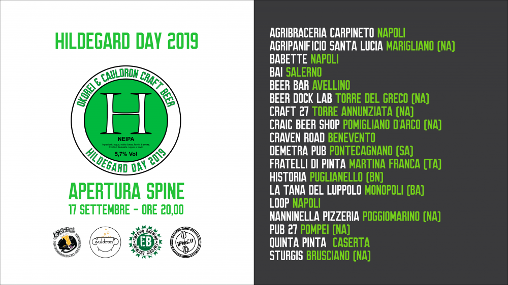 Hildegard von Bingen era una badessa benedettina vissuta nel XII secolo. Grazie ai suoi studi su tutto ciò che la natura offriva all’epoca, con tanto di descrizione delle proprietà di ogni singolo elemento allora conosciuto, si giunge alla consapevolezza delle proprietà del luppolo, il cui fiore è ingrediente fondamentale nella produzione della birra. Hildegard scriveva i suoi libri studiando dai testi della Scuola Medica Salernitana, ed è proprio nella città campana che dal 2015 si festeggia la badessa tedesca, nello stesso giorno in cui la ricorda la Chiesa Cristiana, il 17 settembre. In occasione della quinta edizione, l’Hildegard Day rinnova il format dei primi anni ed esce dalla città di Salerno. Per questa edizione è stata realizzata una birra in cui il luppolo è il protagonista assoluto. Il suo nome è H, Neipa realizzata da Okorei Microbirrificio e Cauldron Craft Beer. Questa birra sarà presente in 18 locali, tra Campania e Puglia, e sarà spillata in contemporanea a partire dalle ore 20,00 del 17 settembre. Oltre alla degustazione di questa birra unica, al BAI di Salerno (Via Arechi 150) alle 22,00 si terrà una degustazione guidata di sigari toscani abbinati alla birra, un classico per questa manifestazione. Questi i diciotto locali aderenti all’iniziativa, dove si potrà bere la H: Agribraceria Carpineto – Napoli, Agripanificio Santa Lucia – Marigliano (Na), Babette – Napoli, BAI – Salerno, Beer Bar – Avellino, Beer Dock Lab – Torre del Greco (Na), Craft 27 – Torre Annunziata (Na), Craic Beer Shop – Pomigliano D’arco (Na), Craven Road – Benevento, Demetra Pub – Pontecagnano (Sa), Fratelli di Pinta – Martina Franca (Ta), Historia – Puglianello (Bn), La Tana del Luppolo – Monopoli (Ba), Loop – Napoli, Nanninella Pizzeria – Poggiomarino (Na), Pub 27 – Pompei (Na), Quinta Pinta – Caserta, Sturgis – Brusciano (Na).