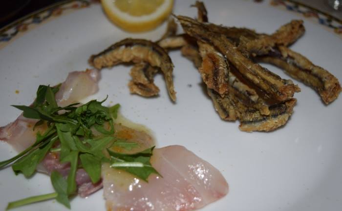 Ed è così che nasce l’idea dell’antipasto della serata: carpaccio di ombrina con salsa di cedro al pepe verde e bottarga, abbinato ad un fritto di pesce classico, alla maniera napoletana.