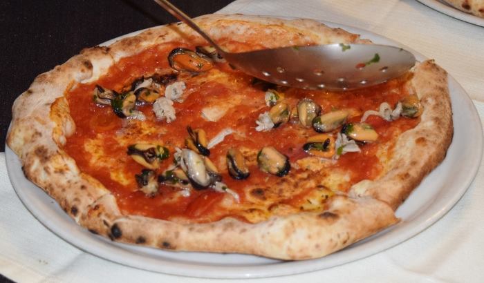 Poi è la volta della pizza con provola affumicata e scarola saltata con uva passa e pinoli e si conclude con la presentazione di un nuovo prodotto, la pizza “Mille culure”, dedicata a Napoli ed al cantautore recentemente scomparso Pino Daniele, una marinara con cozze cotte nella loro acqua, con aglio, olio e prezzemolo. Per addolcire il palato, la torta setteveli.
