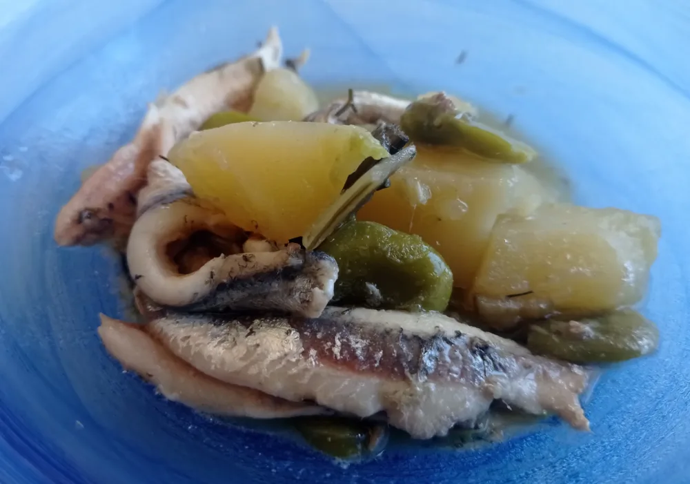 Ecco poi entrare in scena il Cauraro, un classico piatto povero locale, fatto con patate, bietola, fave, cipolla e finocchietto selvatico, a cui si aggiungono le sarde, oppure i “muzzuncielli”, i residui delle alici appena pescate che si sminuzzano quando si estraggono dalla rete.