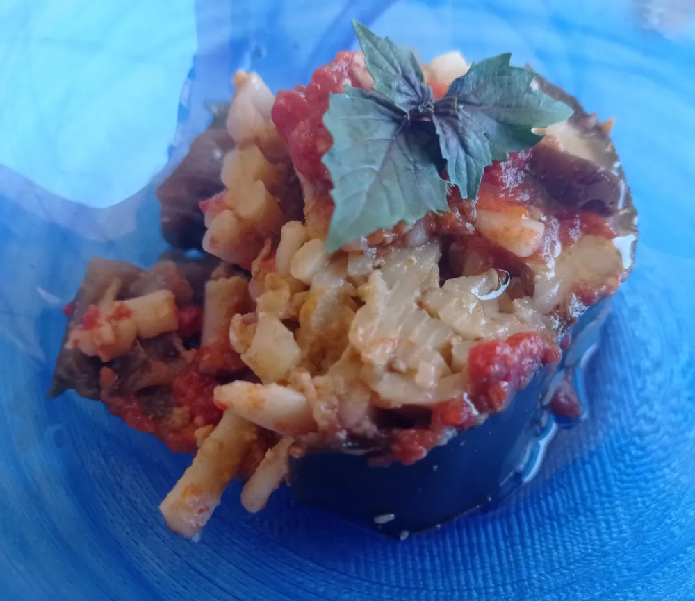 Ancora un altro piatto tipico e territoriale: Mulignana ‘mbuttunata, farcita con spaghetti spezzati, fagioli freschi, pomodori e patate.