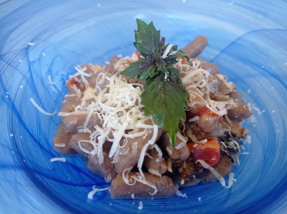 Sotto col piatto della centenaria, ossia cavatelli integrali preparati con una miscela multicereale di grani antichi