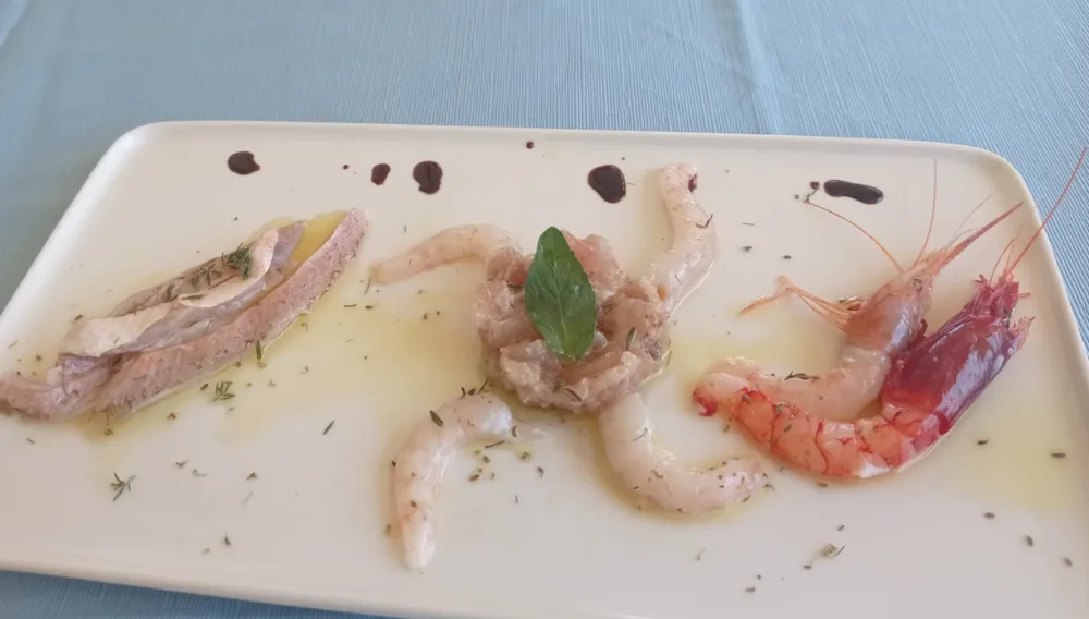 Crudo di pesce leggermente marinato e condito con olio evo della monocultivar pisciottana. Solitamente questo piatto cambia a seconda del pescato locale giornaliero. Nel nostro caso siamo stati fortunati a trovare triglie, perchie, alalunga o tonno alletterato, gamberi gobetti, bianchi e mezzi rossi.