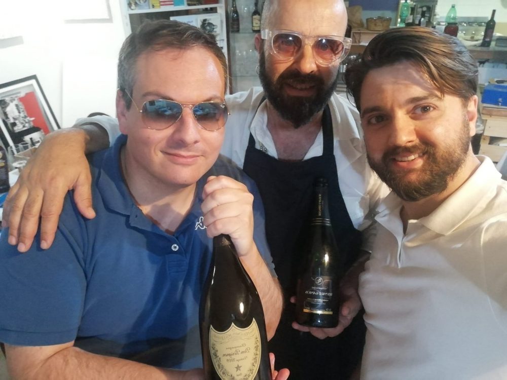 Tutto buonissimo. Il mare, reso edibile. Note iodate a gogò. E per una volta, dalla pur ricca carta dei vini, in cui troviamo quasi tutto il Cilento, ho scelto altro, sono volato oltralpe con uno champagne, il Bernard Gantois, che non sarà il Dom Perignon, che ho in mano nella foto, ma che è stato il piacevolissimo sodale di questa cena di mare.