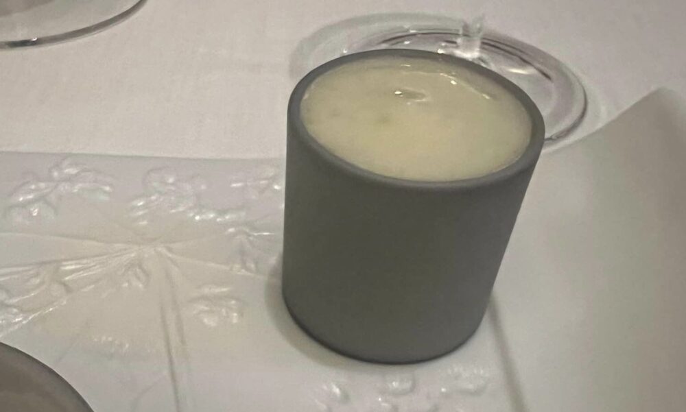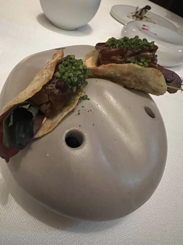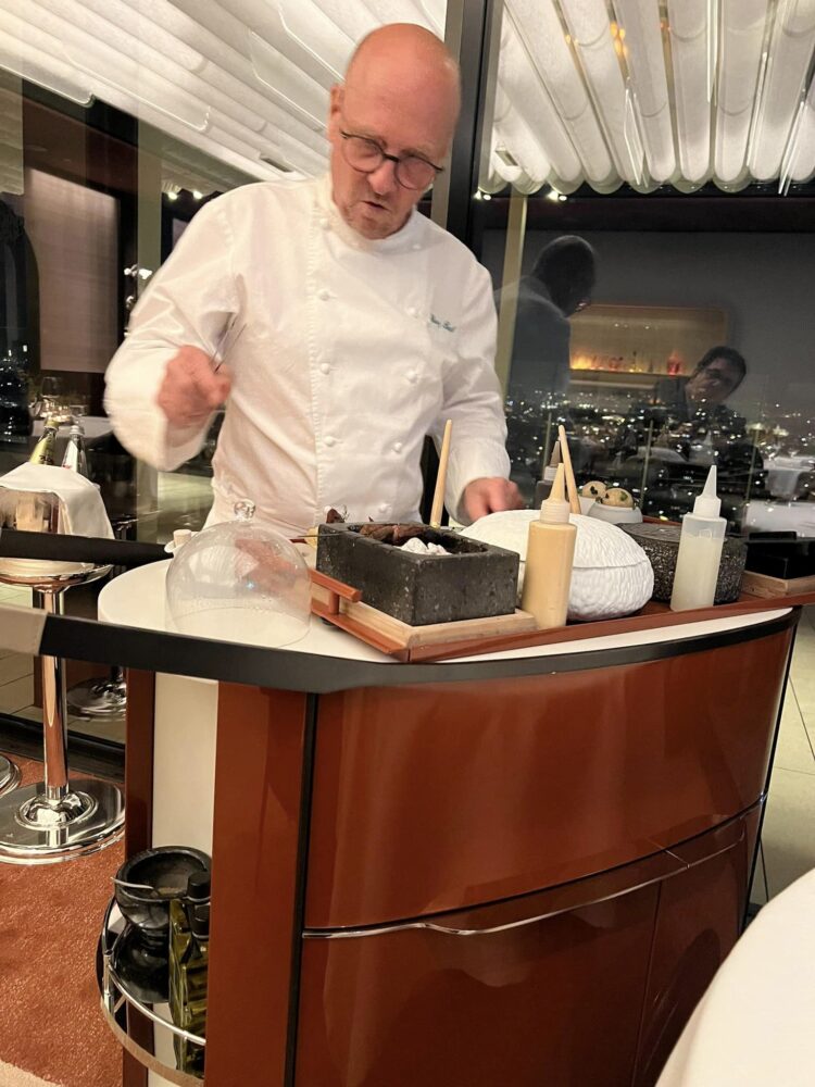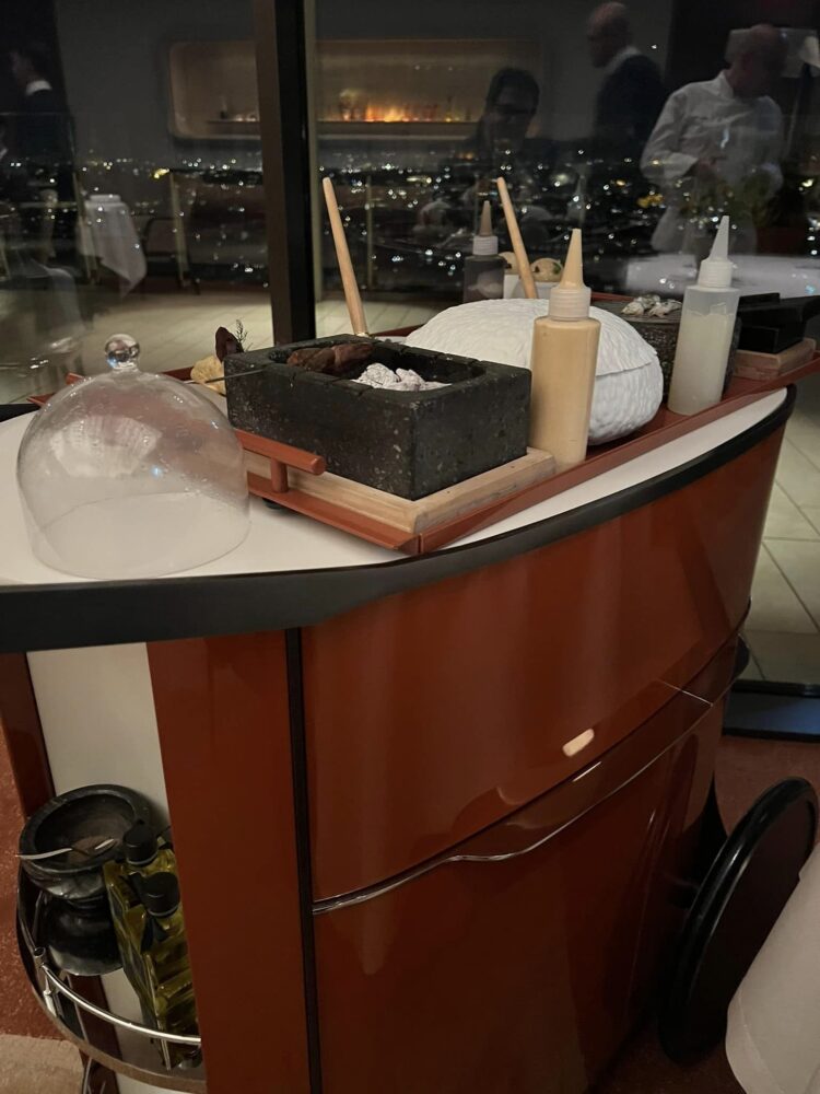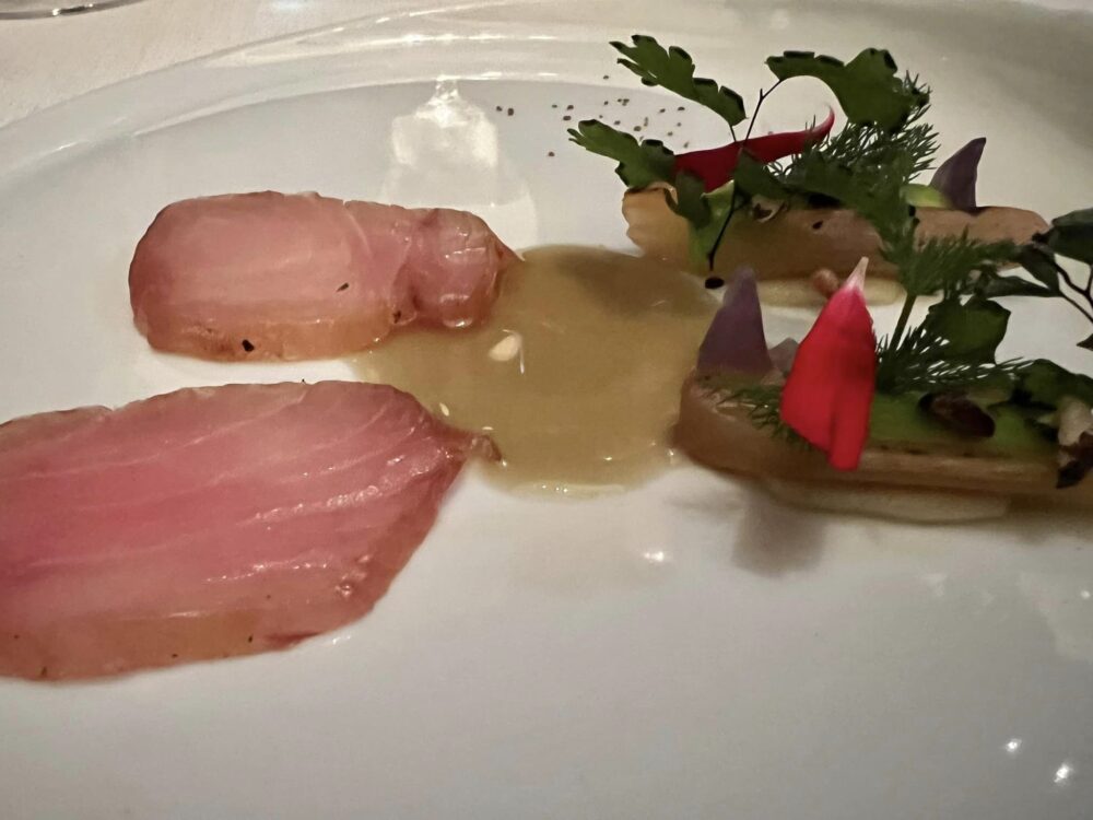 La Pergola resta un ristorante nel senso classico del termine: hotellerie di pregio, mise en place classica con la cura dei dettagli (le iniziali dei clienti sui tovaglioli)m carello dei formaggi, cantina con 3700 referente forse seconda solo a Pinchiorri (oltre 90mila bottiglie da gestire), bar con distillati e liquori per ogni evenienza, carta delle acque e delle tisane oltre che dei caffè. Insomma una esperienza completa. Prende piede la cucina da sala, con lo chef e i suoi cuochi che prerano l’aperitivo al tavolo in stile omakase giapponese. Tutti colpi ben assestati al palato che ti fanno venire la voglia di trascorrere tutta la serata con questa batteria di tapas mentre molti piatti vengono completati al momento con salse e brodi leggerissimi e dal sapore molto concentrato.