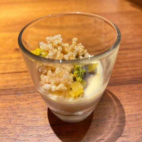 Le foto rappresentano una cena fatta quando l’autunno era appena accennato con ancora qualche richiamo estivo, si parte con l’aperitivo servito al banco giusto di fronte alla cucina. Sette bocconi divertenti, piacevoli, coerenti al luogo e ben fatti. Si passa al tavolo sempre con una bella vista sulla cucina.