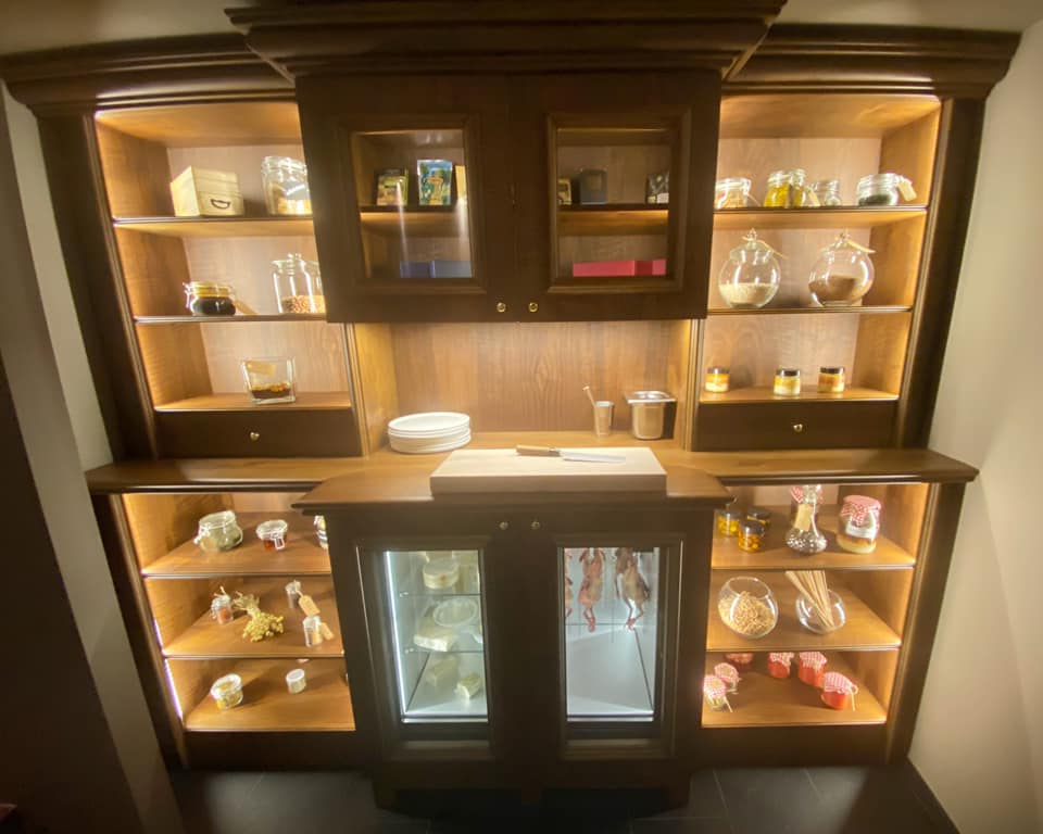 Emblematica la credenza posizionata subito prima della cantina. Qui trovano posto ottimi formaggi calabresi e qualche chicca d’oltralpe, i piccioni a frollare, le confetture ed i mieli, i vasi di fermentati. Un simbolo a rappresentare l’ospitalità del sud Italia in cui i migliori bocconi che la credenza custodiva erano per l’ospite.