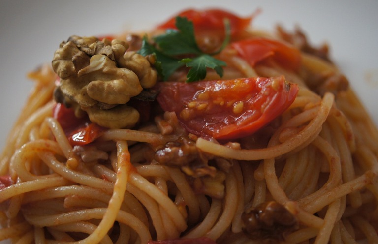 Spaghetti con soffritto di noci e pomodorini del piennolo