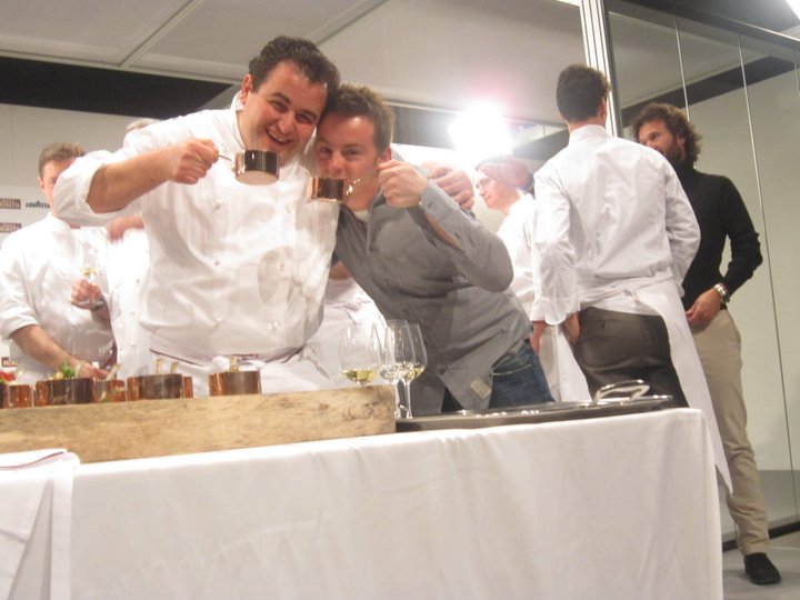 Ore 13 e 45 , subbuglio sul palco dell’Auditorium , arrivano i Cavalieri, si, I cavalieri della Cucina Italiana, un gruppo di chef super star che si è messo insieme grazie ad un’idea di Raffaele Alajmo. Si propongono come simbolo di rinnovamento e voce unitaria della categoria. Si spera si tratti di un vero momento di svolta per tutta l’alta ristorazione italiana. Quattordici, tra i più preparati e famosi chef italiani, insieme per la prima volta al fine di sferrare la loro offensiva per operare un radicale cambio di rotta, . Un “coro” che si riconosce negli stessi valori condivisi in base ai principi stessi del cavalierato: rispetto e lealtà reciproche. I magnifici 14 sono già all’opera per allargare la base di adesione, per cercare di riunire il maggior numero di colleghi, si tratta di una vera e propria svolta concettuale: lasciare il sé per sposare il NOI.