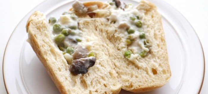 Mescolare a caldo con la besciamella, i pisellini, i funghi e la mozzarella affumicata ben sgocciolata e tagliata a pezzettini. Riempire i conglufi con il ripieno caldo fino all’orlo e appoggiarvi sopra il cappuccetto.