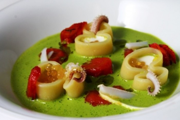 Insalata liquida di scarola con campotti di Gragnano “Pastificio dei Campi”, crema di bufala, caviale di alici, calamaro e datterino confit di Stefano De Gregorio