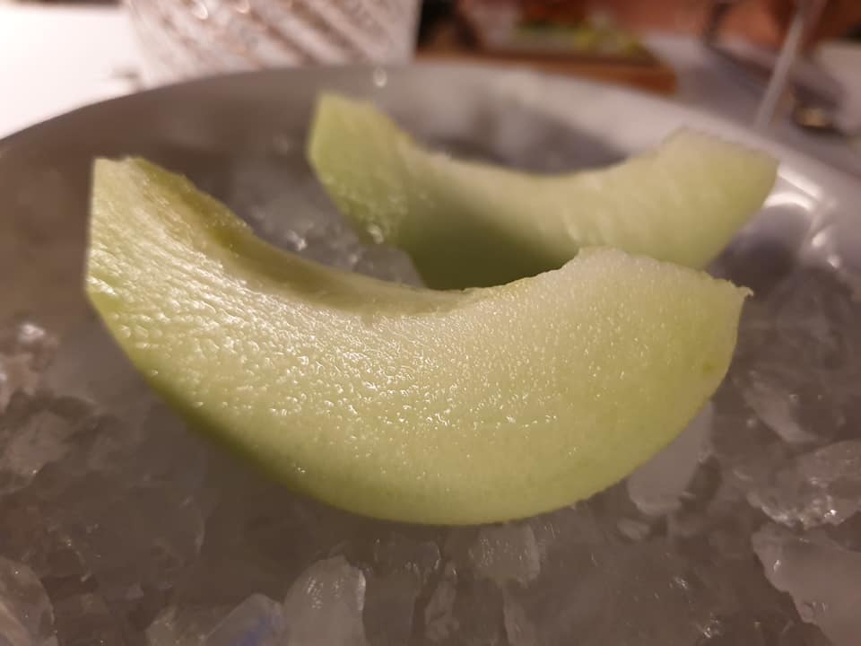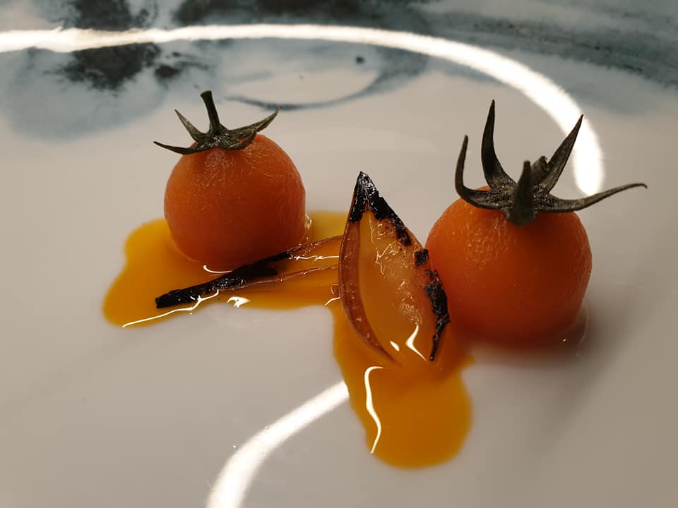 Due amuse-bouche per iniziare: gratin di cozze e spuma di acqua di mare e i “jammarielli”, piccoli gamberetti di fiume, tipici di Sarno, con avocado. Piacevole intermezzo con il “barattiere”, detto anche melone immaturo, un incrocio fra il cetriolo e melone, che cresce unicamente fra Ostuni e Fasano, paese di origine di Marzolla.