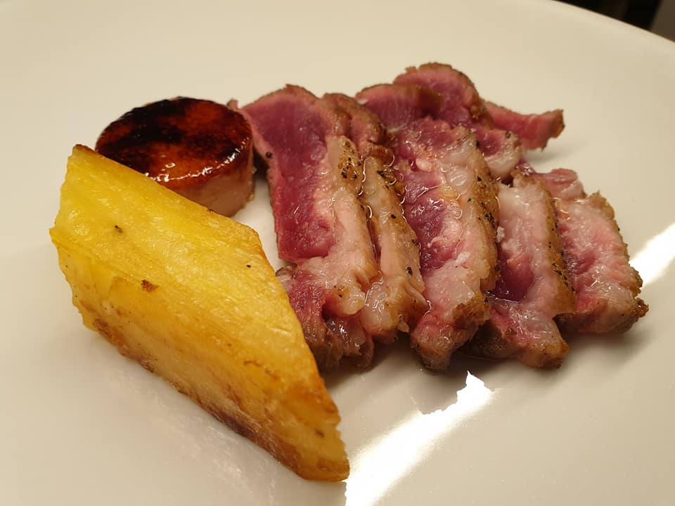 La parte salata della cena si conclude con una pluma di maialino iberico accompagnato da un millefoglie di patate e parfait di foie gras caramellato.