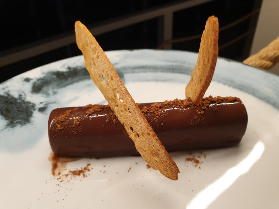 Divertente il “pane cafone” con una mousse di cioccolato fondente al 70% e polvere di olive.