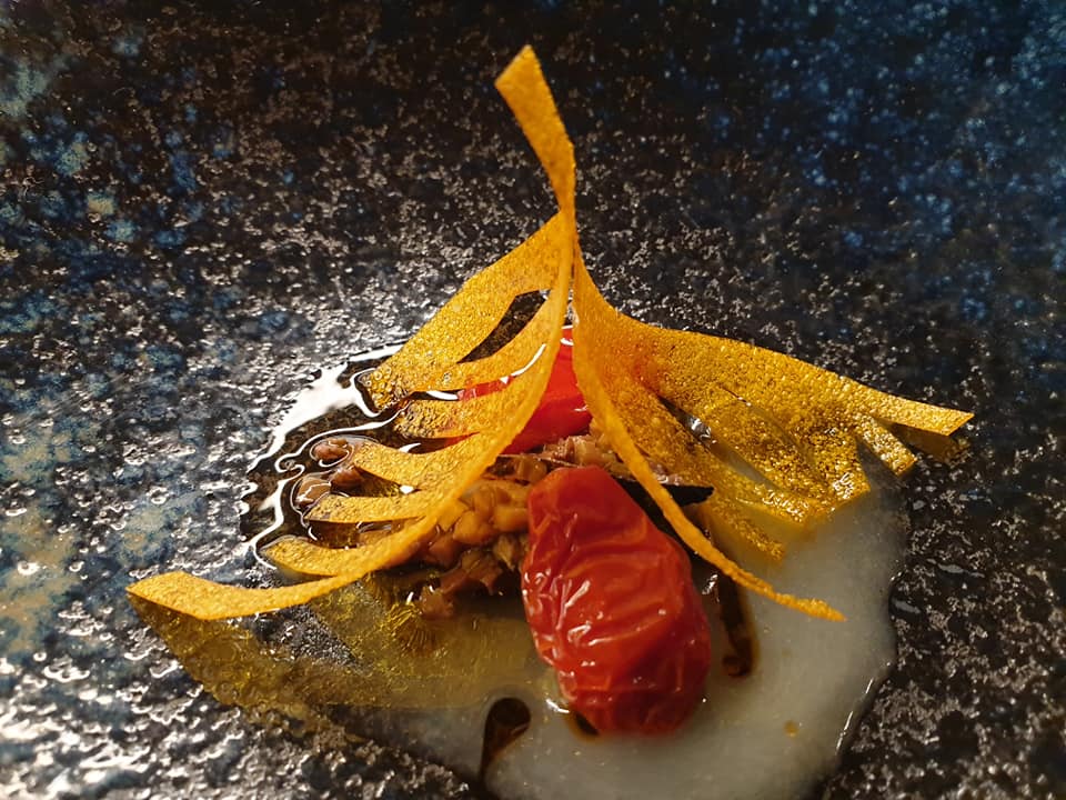 La spigola in crosta di patate con carote e verdure marinate a caldo ed olio aromatizzato al basilico, mostra la bravura tecnica di De Blasio. Cottura millimetrica del pesce, le patate croccanti mentre l’acidità delle verdure fermentate creano un contrasto veramente gradevole.