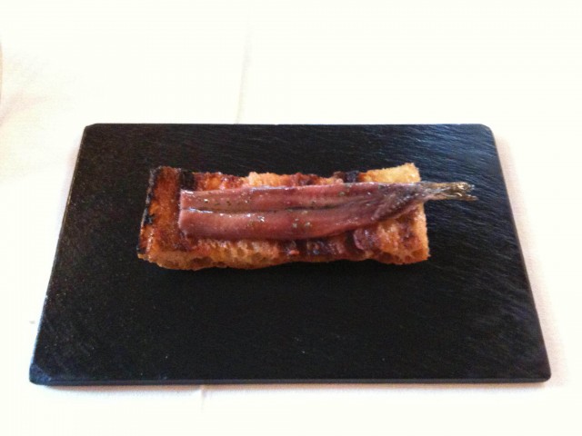 Pane e alici salate: il pesce, appena spennellato di una bagna di olio aglio e prezzemolo, è ciccioso e primario nel sapore. Il crostino però, ovviamente grigliato, sconta un eccesso di durezza, rendendo difficoltoso l’approccio.