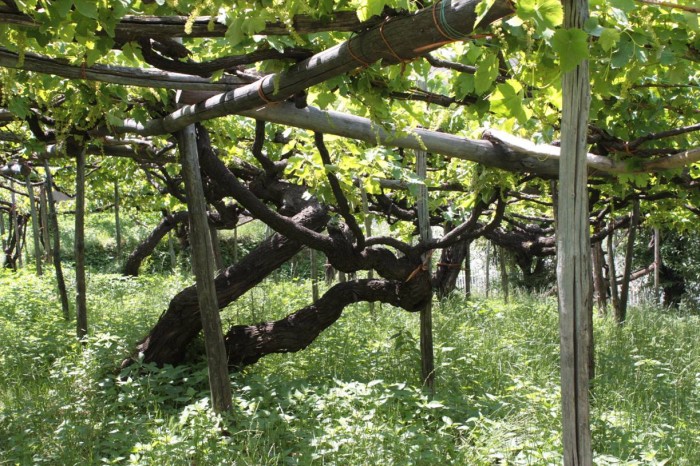 La visita ai vigneti di Tramonti terza sottozona della doc Costa d’Amalfi, intorno al monte Chiunzi, è tra le più singolari e straordinarie che si possano immaginare, come fare un viaggio indietro nel tempo: da oltre cento anni le viti crescono trasformandosi in enormi tronchi, le colline sono tappezzate da questi pergolati ricchi di grappoli utilizzati per favorire al piano del terreno la coltivazione di ortaggi. Esempio di agricoltura a due piani tipica della Terra delle Sirene, per guadagnare spazio in un territorio dove si lotta ogni giorno con la roccia e per trattenere meglio l’umidità. Tutto è rimasto come sempre, i mezzi meccanici non possono accedere tra i ripidi pendii o lavorare sotto le pergole, i sapori del terreno entrano nel vitigno e finiscono nel bicchiere.