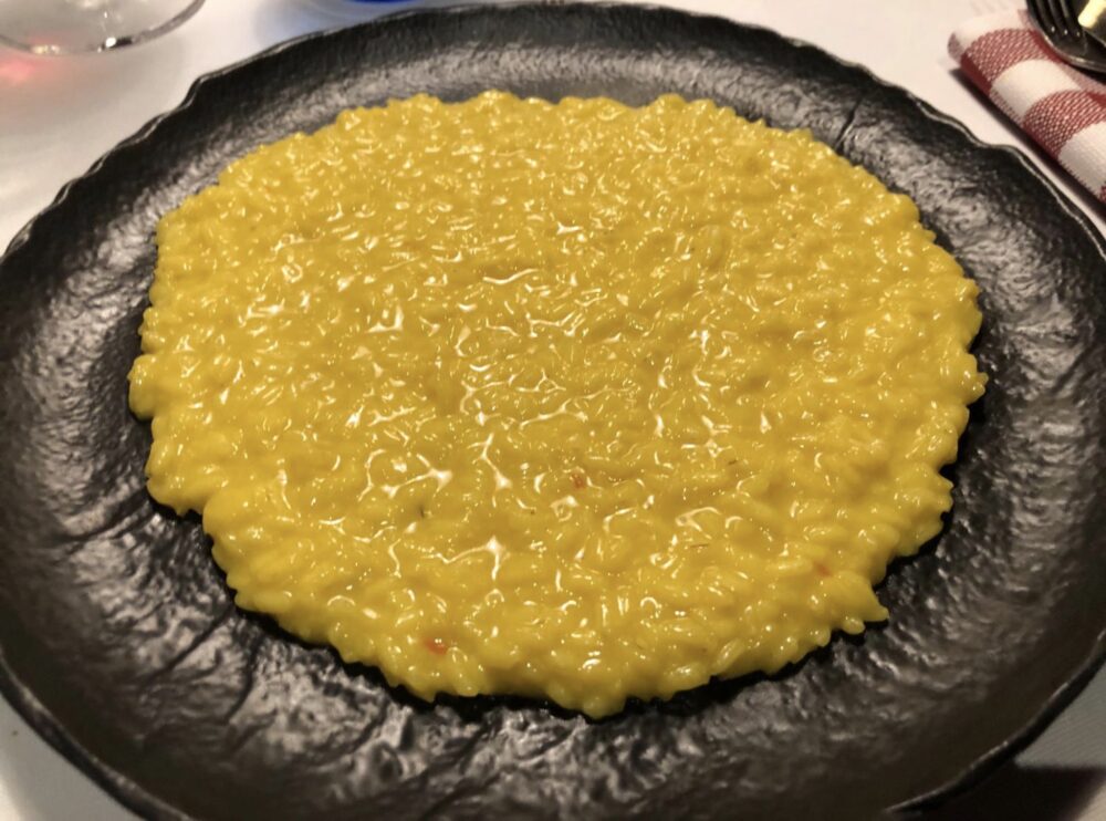 Risotto allo zafferano, ben eseguito, la cartina al tornasole di ogni locale lombardo che si rispetti si colora di ocra, ton sur ton con la parete