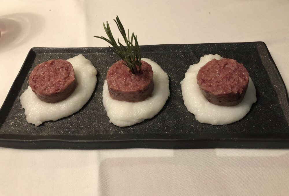 Polenta bianca con lo strepitoso cotechino vaniglia, così chiamato per il suo gusto particolarmente dolce dovuto ad una breve stagionatura e alla sua leggera speziatura, consistenza morbida e sapidità sotto controllo, l’assaggio che vale il viaggio