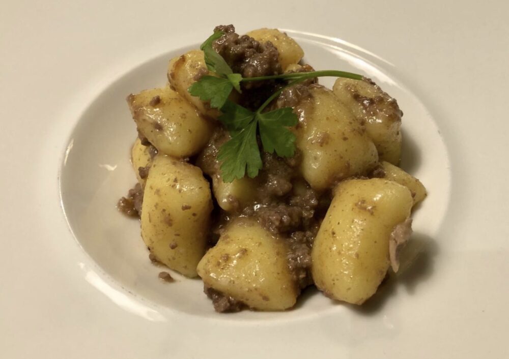 Gnocchi di patate con ragù di cinghiale, la patata di Oreno è sicuramente una delle eccellenze gastronomiche del territorio brianzolo, la coltivazione a chilometro zero è un motivo in più per puntare il dito sulla carta delle vivande in corrispondenza della parola patata che nella dispensa dell’Osteria non arriva per corrispondenza ma, presumibilmente, sul trattore di uno dei contadini vicini