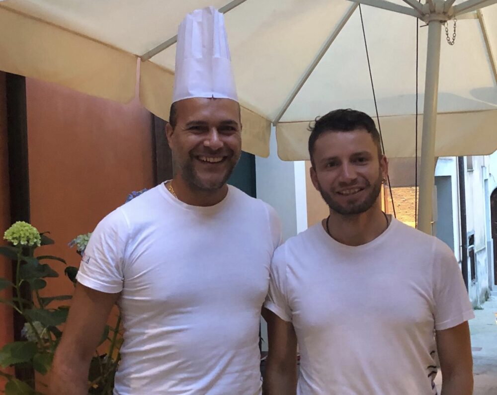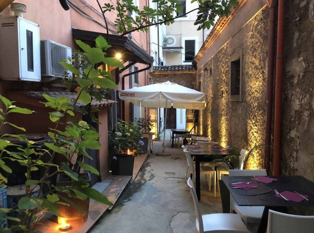 I tavoli all’aperto nel vicolo che beneficiano del servizio attento e cortese di Domenico, senza cappello nella foto di apertura, c’è Armonia a Vallo, qui e nella bellissima pizza