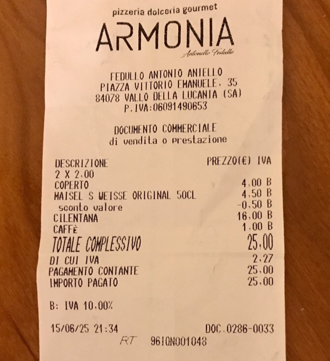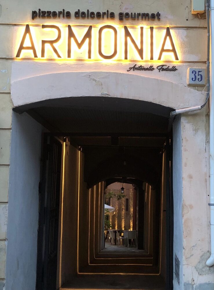 Sia la Cilentana (imperdibile) che la 3 pomodori sono risultate scelte vincenti che, se non ci fossero ottocento km di distanza, rifarei con estrema soddisfazione con frequenza quanto meno settimanale, anche e non solo per il rapporto qualità prezzo che ritengo estremamente vantaggioso, una pala a due gusti di questo livello a sedici euro è sicuramente un regalo che commuove maggiormente quando si scopre che il caffè sul conto viene conteggiato euro uno, cosa che nemmeno in piedi al bar della stazione… a proposito di stazione Vallo, con la sua piazza tra le più belle d’Italia, è fermata obbligatoria così come Armonia, il bel locale di Antonello che ha il suo ingresso proprio sulla piazza, varcato un arco sapientemente illuminato ci si trova in un vicolo, ci si siede all’aperto e, ci metto la firma, si gode.