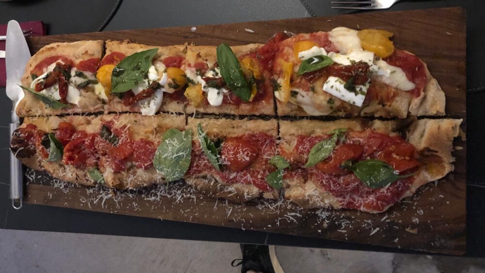 Nella sua accogliente Pizzeria Antonello Fedullo propone un prodotto altamente apprezzabile per svariati motivi, primo fra tutti il gusto, morso accattivante, sapori riconoscibili, qualità della materia prima, la consistenza è croccante esternamente, come deve essere la pala, ma non biscottata, morbida all’interno, la pizza è digeribilissima, le dimensioni della pala, 50 cm., non sono assolutamente un problema e questo la dice tutta sull’estrema leggerezza dell’impasto.