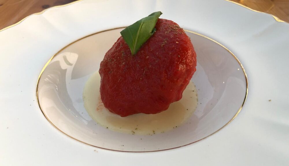 L’Ammaccata Originale “quella del ricordo di mia nonna Teresa” pomodoro cotto alla cilentana, cacioricotta di capra Slow Food, origano di montagna, olio extravergine riserva Coratina-Itrana Fattoria Ambrosio (Miglior Olio d’Europa “Il Magnifico 2025”).
