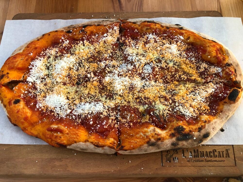 L’Ammaccata Marinata, con salsa di pomodoro marinato, aglio e origano dei Monti Alburni e olio extravergine Alterego del pluripremiato Frantoio Marsicani