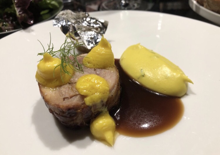 Aquadulcis, pollo in porchetta, impreziosito da uno strepitoso fondo e da un’ottima crema di patate allo zafferano, accompagnato da un po’ d’insalata fresca, (una rarità nei ristoranti italiani di un certo livello) servita in un piattino a parte, pollo succulento, saporito, morbido, il piatto che vale il viaggio Milano-Vallo