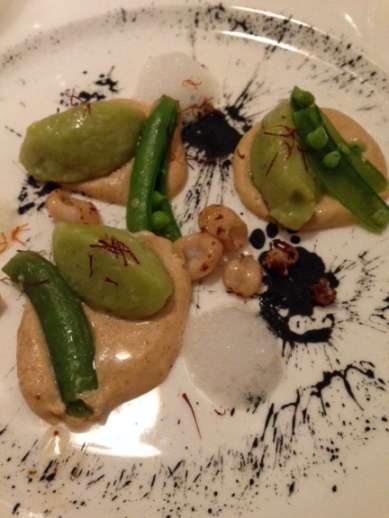 Gnocchi di fave, calamaretti spillo, ricotta infornata, taccole e pistilli di zafferano, Mood di Gallarate