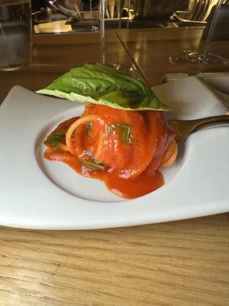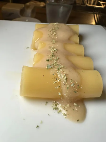 Il pacchero ai sette pomodori di Antonio Iacoviello di Gucci Osteria a Tokyo. Conosco Antonio Iacoviello da qualche anno, è stato anche uno dei vincitori del nostro Contest dei Campi. Lo ritrovo a Tokyo, chef di Gucci Osteria, nel quartiere esclusivo di Ginza. Antonio fa una cucina italiana contemporanea con prodotti locali e soprattutto con piccoli produttori, artigiani a servizio dell’artigiano in cucina, dall’Italia arriva il Parmigiano, la pasta, l’olio extra vergine d’oliva. Personalità, voglia di non essere scontato, tecnica. Su tutto un meraviglioso pacchero ai sette pomodori che mi ha emozionato. Piatto dell’anno fuori dall’Italia per 50 Top Italy 2024.