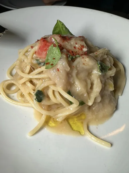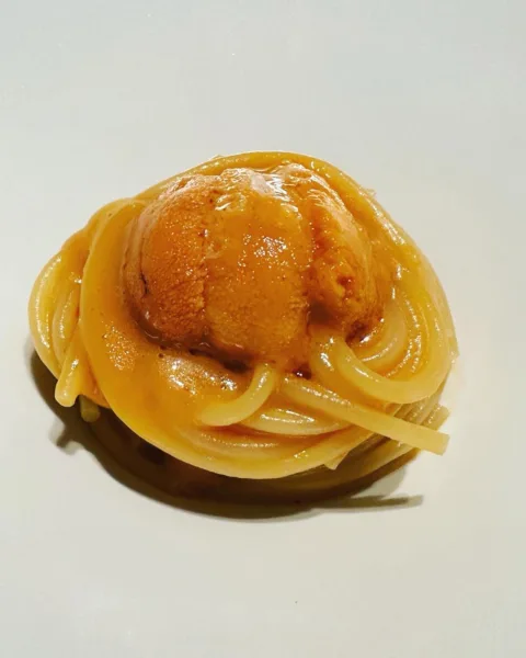Spaghetti con i ricci di Hokkaido di Luca Fantin, il ristorante Luca fanti a Tokyo. Siamo partiti da Tokyo e finiamo per ritornare a Tokyo. Luca Fantin all’interno del Bulgari a Tokyo porta un pezzo di Italia in terra del Sol Levante e ci riesce con garbo ed eleganza, come i suoi spaghetti ai ricci di Hokkaido. Piatto diverso da quello che troviamo nei nostri ristoranti perché i ricci di Hokkaido sono meno sapidi di quelli del Mediterraneo, quasi burrosi. In questa versione diventano tremendamente eleganti e buoni. Chef dell’anno fuori dall’Italia per 50 Top Italy 2024.