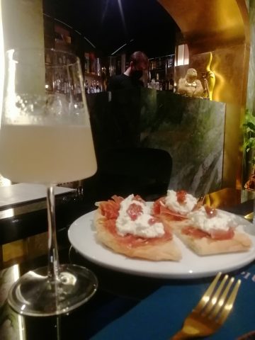 Emanuele fa del suo lavoro una passione e uno studio costanti: “non serviamo da bere, da mangiare, ma serviamo le persone” dice. L’ambiente è accogliente e intimo. Il concetto è quello di un’esperienza che passa attraverso l’abbinamento dei cibi ai cocktail. La ratio è la stessa dei vini: per contrasto o per affinità. Tra l’altro, la miscelazione è fatta anche di vini. Soprattutto passiti e tokai, grande passione di Emanuele. Da apripista ci serve il Nike, un misto di vodka, fiori di rosa e sambuco, più lime. Morbido e profumato al punto giusto per iniziare la nostra esperienza. Si continua con una pinsa romana fatta di Jamon serrano, stracciata di bufala e pomodorini del Vesuvio extra dry.