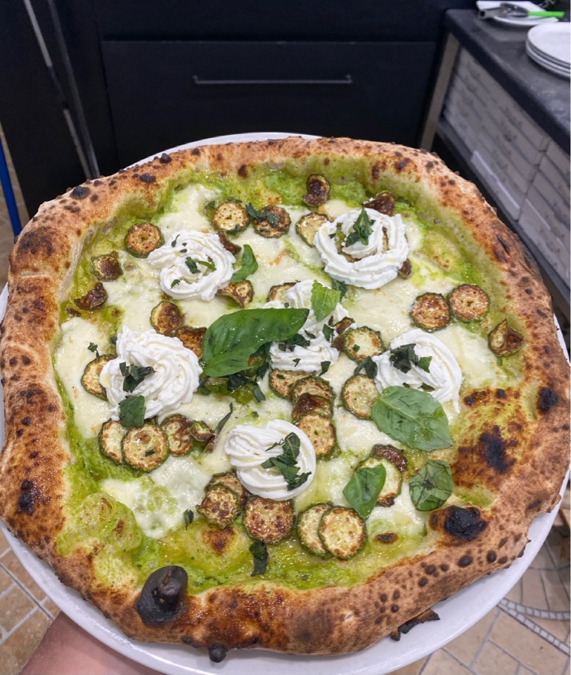 Ingredienti: Cornicione ripieno di crema di bufala, topping: provola di Agerola, fiori di zucca fritti (all’uscita), crema con zucchine e fiori di zucca, scaglie di pecorino romano basilico e olio evo.