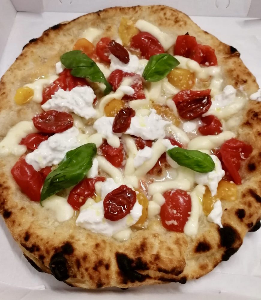 Ingredienti: fior di latte d’Agerola, pomodorini del Piennolo del Vesuvio DOP, pomodorini gialli del Vesuvio a pacchetelle, stracciata di bufala campana DOP, pomodorini confit fatti in casa, olio EVO del Cilento e basilico.