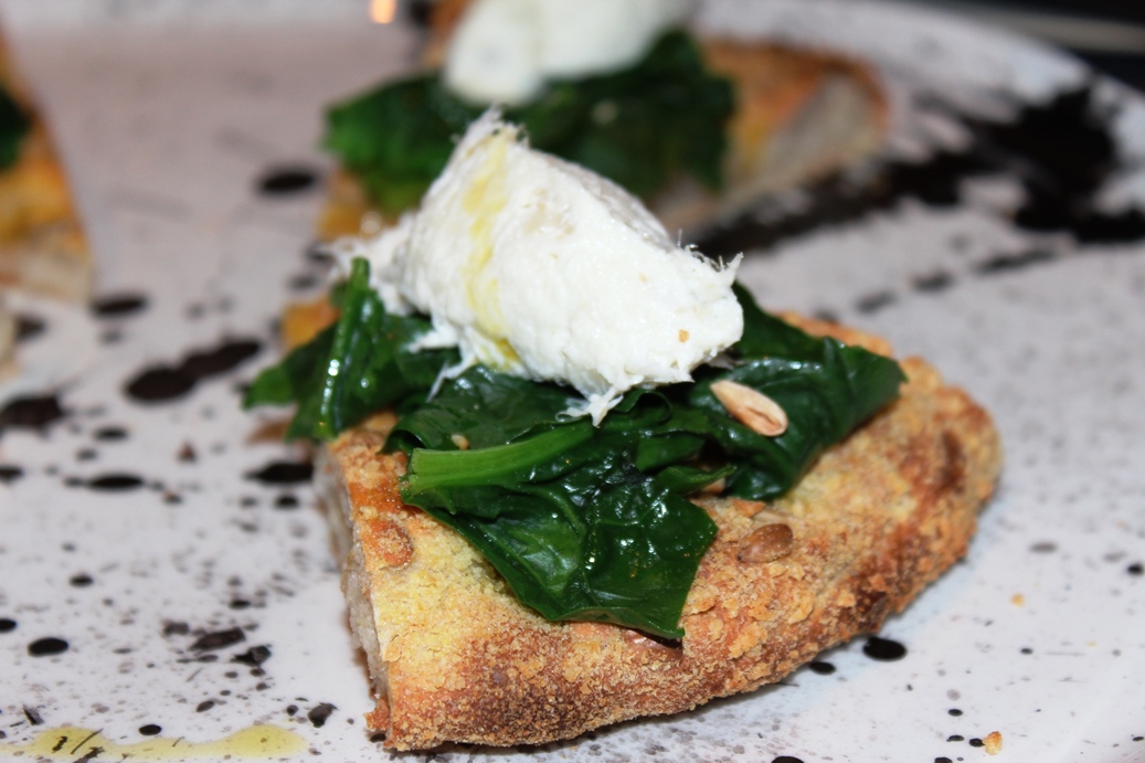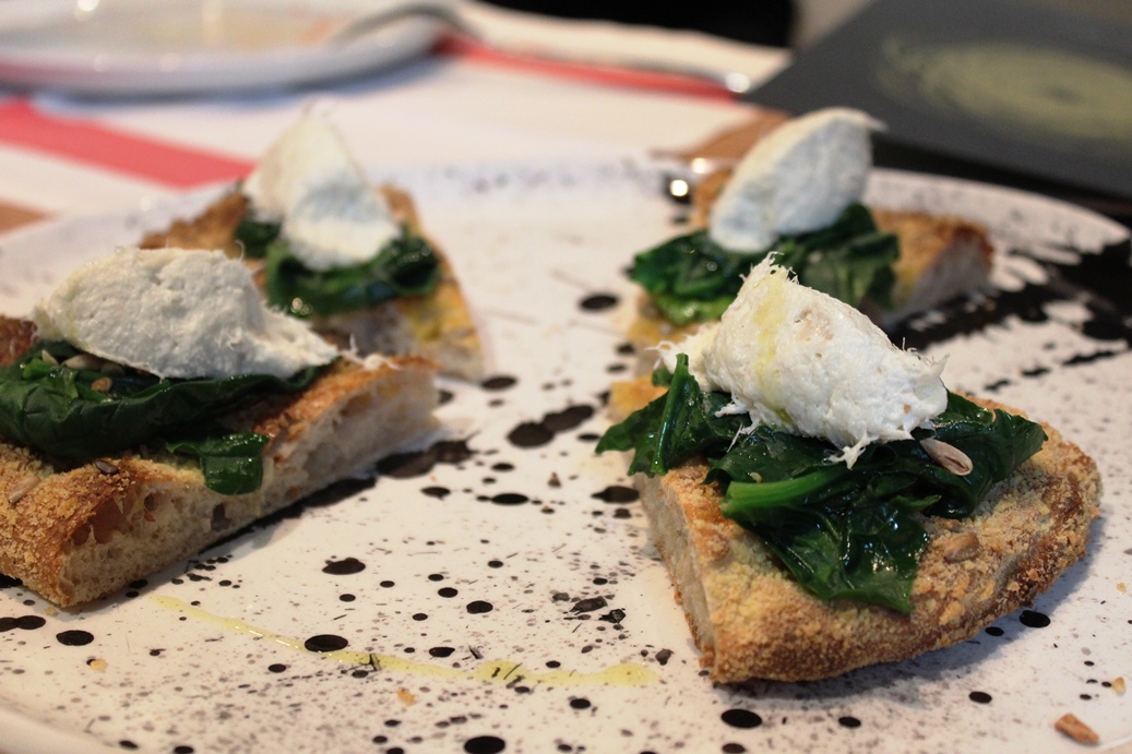 La focaccia con impasto al mais, viene condita con spinaci e pinoli e completata con del baccalà mantecato. Il gusto è delicato e la nota vegetale, quasi ferrosa degli spinaci riesce a “spezzare” molto bene.