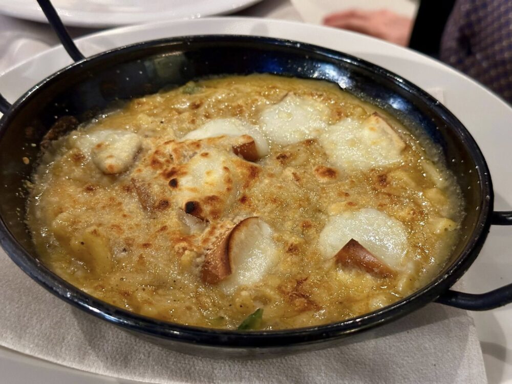 A seguire, la sorprendente “Cotoletta di formaggio” – “Chiavicone” De Gennaro con peperoncini verdi fritti, abbinata all’intensità dell’Aglianico del Taburno DOCG 2020. Finale eccezionale con altre due creazioni: una pasta e patate al Provolone del Monaco “a sorpresa”, e una candela ripiena di ricotta ricavata dal formaggio, ripassata nello zucchero a velo.