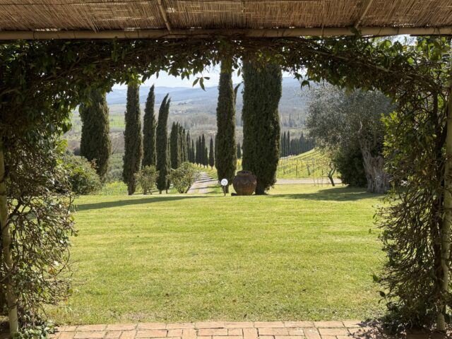 Per raggiungere Le Verzure si attraversano le pieghe morbide delle colline che uniscono la Val d’Orcia alla Val di Merse, fino a Murlo. Da qui, superato un piccolo guado, si entra nei 43 ettari di proprietà tra, vigneti, sughere e macchia mediterranea. L’impatto è immediato: oltre alla natura, l’orizzonte si distende fino al profilo di Montalcino, a pochi chilometri di distanza, lo stesso panorama che incornicia la sala degustazione dell’azienda.