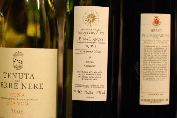 Le tre aziende in degustazione rappresentano le principali identità di questa doc, i loro vini sono prodotti con uva Carricante in purezza, vitigno bianco principe di questa zona, forte e generoso, coltivato tradizionalmente ad alberello per limitare la produzione dei grappoli, essendo la pianta molto generosa, la doc più datata in Sicilia, nasce nel 1968, con ben 3000 ettari coltivati a vigneto. Il primo vino in degustazione è Etna Bianco 2006, tredici gradi, di Tenuta delle Terre Nere, carricante in purezza: il 30% del vino viene vinificato in botti grandi dove svolge fermentazione malolattica ed affinamento per 10 mesi, l’azienda ne produce 4000 bottiglie l’anno, quindi una vera fortuna averlo in degustazione, prodotto nel comune di Randazzo, nella zona nord dell’Etna, a ben 900 mt. s.l.m., di color giallo oro brillante, al naso regala una spiccata mineralità, rivelando pienamente la sua natura vulcanica, dai profumi dolciastri ed intensi di acacia e frutta esotica, con leggero tocco di rosmarino ed una vivace presenza sulfurea; all’assaggio esplode con vivida sapidità e freschezza, è caldo, opulento ed elegante con continui ritorni minerali. Il secondo è Etna Bianco 2006 Val Cerasa, di Alice Bonaccorsi, tredici gradi: anche questo prodotto da uve carricante allevate ad alberello sul versante nord-est del vulcano, a 600-700 metri di altezza, 8000 le bottiglie prodotte in un anno, presenta caratteristiche molto diverse dal precedente, è più sottile, i profumi vertono sull’agrumato. Di colore giallo dorato, dai profumi intensi di grafite, delicati i sentori floreali di gelsomino e agrumi, l’ingresso in bocca è burroso, spiccatamente sapido e di pulsante freschezza, di lunga persistenza gusto-olfattiva, sono appena 5000 le bottiglie all’anno di questa meraviglia.
