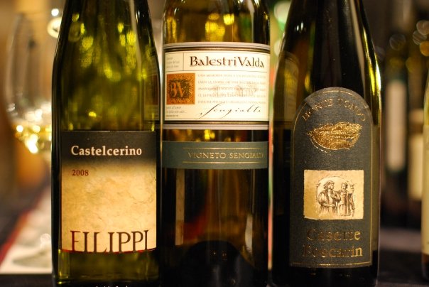 Le etichette qui presentano una tipicità, esprimono sempre il cru di origine, infatti sulla prima bottiglia in degustazione è espressa la provenienza dai Colli Scaligeri, Castelcerino Soave doc 2008 di Filippi, 12,5% gradi, Garganega in purezza proveniente da vigne molto vecchie, anche di 80 anni, su suolo prevalentemente calcareo e seguendo i principi della coltivazione biologica. Il vino si presenta di colore giallo paglierino con riflessi dorati, al naso ha un impatto di mineralità notevole, di pietra focaia che comunque non sovrasta il frutto tipico di mela verde croccante e kiwi, forte, è graffiante l’acidità al palato, è sapido su ripetuti ritorni dei sentori minerali, di lunga persistenza gustativa e sicuramente vocato all’invecchiamento.
