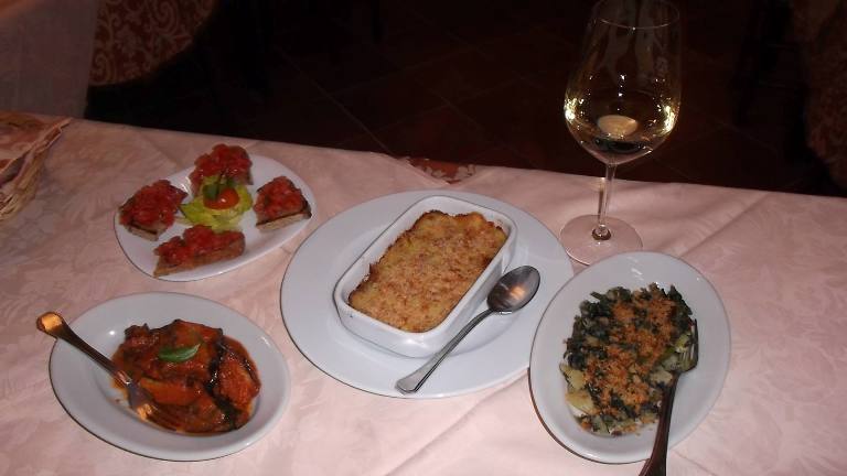 Spizzichi di qua e di là, per un’infinità di eccellenti antipasti di mare e di terra; più un ricco risotto alla pescatora; seguito da un piatto di prelibati formaggi; per finire poi con uno squisito dolce alle fragole.