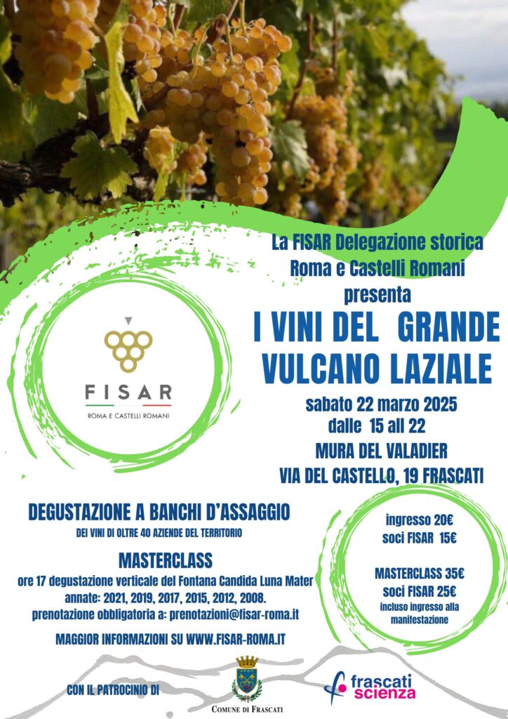 I Vini del Grande Vulcano laziale è il titolo della manifestazione organizzata per il prossimo 22 marzo dalla Fisar Roma e Castelli Romani e che avrà luogo a Frascati. Obiettivo dell’evento è valorizzare e promuovere il vino del territorio a partire dal suo prodotto per antonomasia, il Frascati che, nella versione superiore, è una delle tre Docg della Regione Lazio.